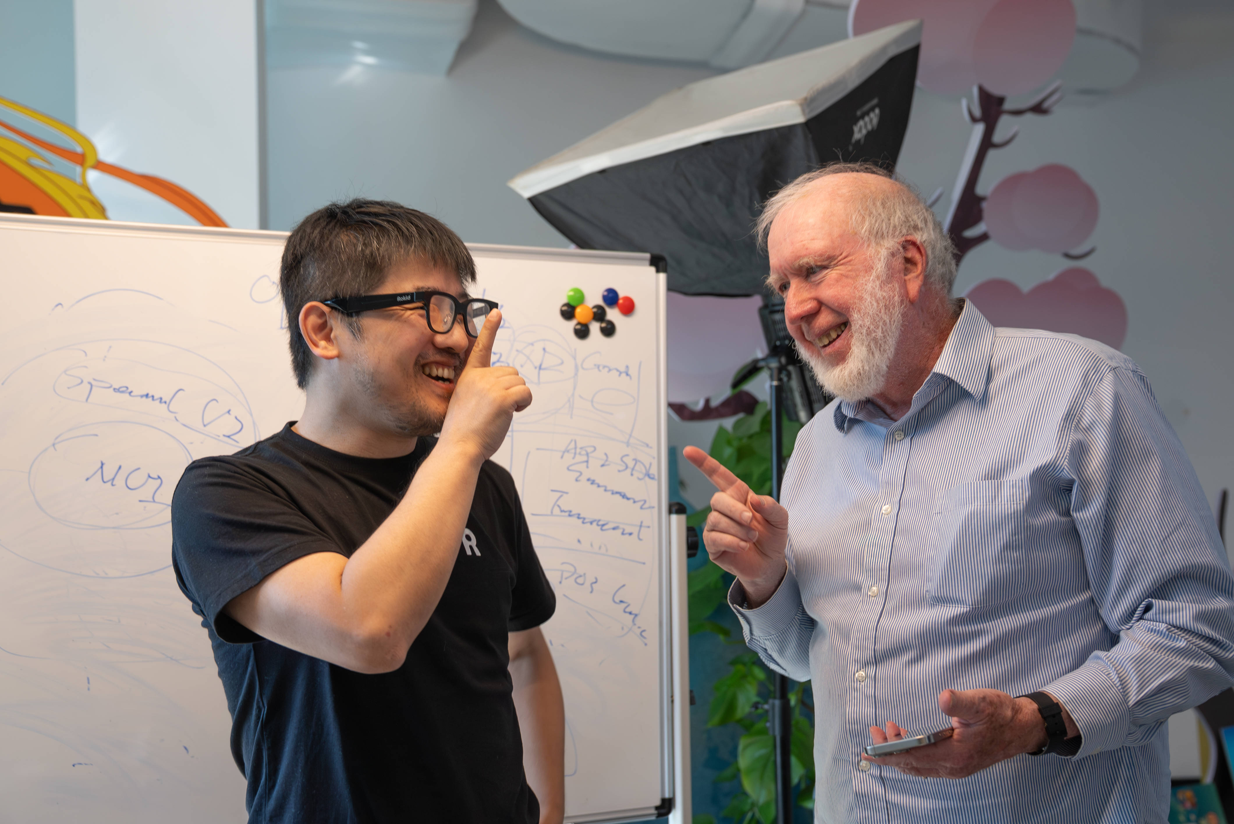 他将杭州行的首站深度访问放在了Rokid乐奇总部,与祝铭明进行了长时间交流,并亲自佩戴体验了Rokid乐奇的多款产品。当虚拟界面与物理空间在他眼前无缝融合时,这位思想家频频点头表示赞许。